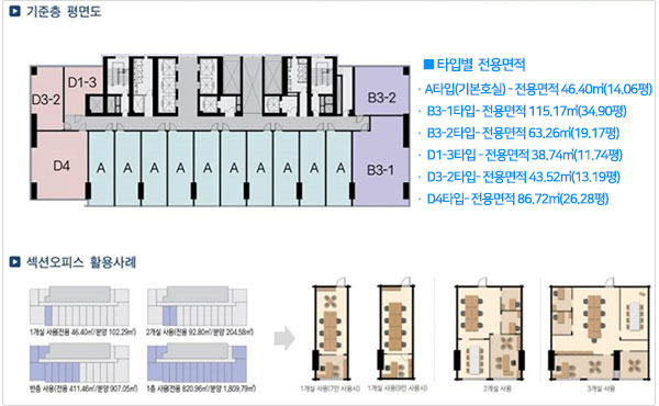 광교sk뷰레이크 오피스는 각 호실 간 벽체의 변경이 가능한 구조로 되어 있어, 필요에 따라 전용면적 28㎡에서 최대 907㎡에 이르는 다양한 타입으로의 변형이 가능합니다.(그림 예시 참조)