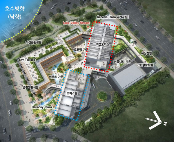 오피스텔동과 오피스동을 각각 대지 대각선 방향으로 배치되어 모든 실이 "정남향"과 "광교호수공원 조망"을 누릴 수 있도록 하였습니다.