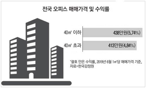 실제 지난 2013년 7만 7009개 수준에 불과했던 1인 기업은 2017년 26만 4337개로 집계돼 5년 새 3배가 넘게 늘어났다. 늘어난 수요는 소형 오피스 수익률을 증가시키고 있습니다. 지난 6월 기준 전국 40㎡ 이하 오피스의 수익률은 5.74%로 집계된 반면, 40㎡ 초과 오피스의 경우 4.84%로 나타나 소규모 평형에서 더욱 높은 수익을 올릴 수 있는 것으로 나타났습니다. 평균 단위(1㎡) 당 매매가격도 전국 40㎡ 이하 오피스는 438만 원으로 40㎡ 초과 오피스 413만 원보다 25만 원 높았습니다.