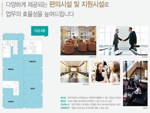 1인 창업자들이 섹션오피스를 선호하는 것은 일반 소규모 사무실에 없는 회의실, 카페테리아, 구내식당을 비롯해 휘트니스센터, 헬스케어센터 등 다양한 부대시설을 제공하기 때문이며, 또 빌딩 전체가 업무시설이기 때문에 프라임급 사무실 못지않은 기업의 네임밸류를 갖출 수 있는 것도 선호하는 이유입니다.