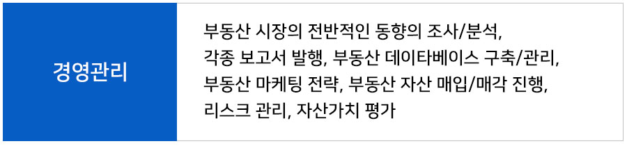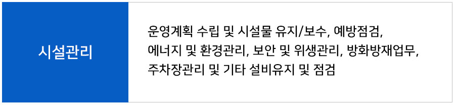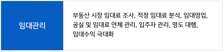 주요 업무는 부동산 자산의 투자 및 매각, 수익 증대, 가치 상승을 위한 경영관리 지원, 공실해소, 우량임차인 유치 및 유지, 임대수익 극대화를 위한 임대관리 지원, 입주 및 퇴거관리, 민원법수 및 처리, 관리비 부과 등을 위한 운영관리 지원, 시설물 유지/보수/운영, 에너지 관리, 인력관리 등을 위한 시설관리 지원 등의 서비스를 제공합니다.