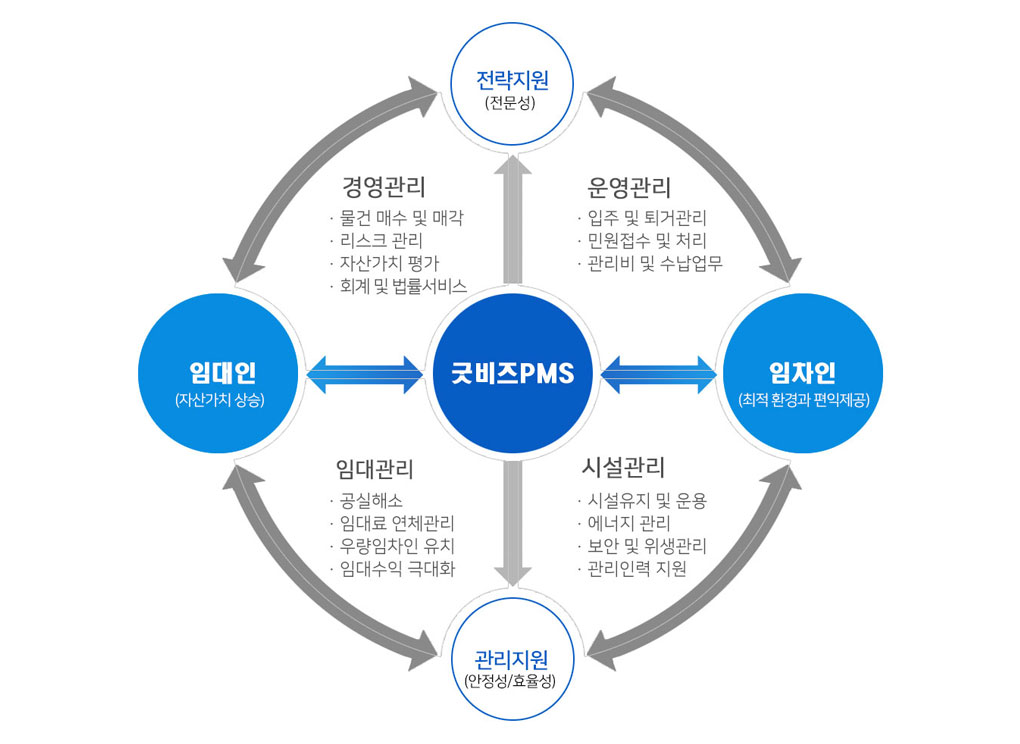 저희 '굿비즈PMS'는 고객의 부동산 투자 수익과 자산가치 증대를 위해 부동산을 효율적으로 운영 관리하는 종합자산관리서비스(Property Management Service) 회사입니다.