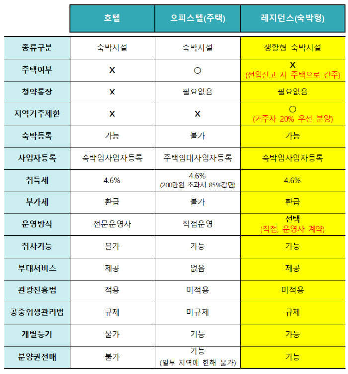 일반적으로 호텔과 비슷해 보이지만 실내 취사나 세탁 등을 갖춰 주거 공간처럼 생활할 수 있다는 점에선 차이가 있습니다. 즉, 정부의 부동산 규제와 주거 트렌드에 대응하기 위해 아파트와 호텔, 오피스텔의 장점만을 결합한 새로운 개념의 거주공간이라 할 수 있습니다.