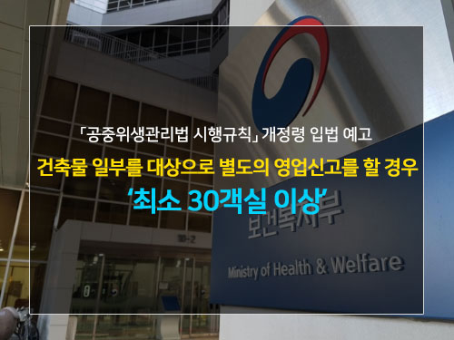 무엇보다 현행 공중위생관리법상에는 건축물 일부를 대상으로 한 숙박업 영업 신고 기준 중 따로 ‘객실 수 규정’을 두고 있지는 않지만, 지난해 9월 보건복지부는 ‘창업 규제 완화와 일자리 창출 애로사항 해소’ 취지로 건물에서의 숙박영업에 대한 신고 등 기준을 담은 「공중위생관리법 시행규칙」 일부 개정령을 입법 예고했습니다.