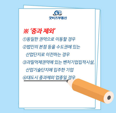 하지만 동일한 권역으로 이동하거나 이전 법인의 본점 등을 수도권에 있는 산업단지로 이전하는 경우는 '중과 대상에서 제외'됩니다. 또 과밀억제권역에 있는 벤처기업집적시설·산업기술단지에 입주한 기업에 대해서는 취득세·등록면허세·재산세 등을 중과하지 않으며, 또한 이전 법인이 은행업, 첨단기술산업, 유통산업, 사회기반시설사업, 의료업, 전기통신사업 등 대도시 중과제외 업종에 직접 사용할 목적으로 취득한 부동산에 대해서도 취득세가 중과되지 않습니다.