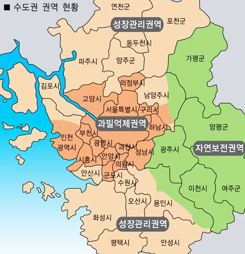 1. 과밀억제권역: 인구와 산업이 지나치게 집중되었거나 집중될 우려가 있어 이전하거나 정비할 필요가 있는 지역