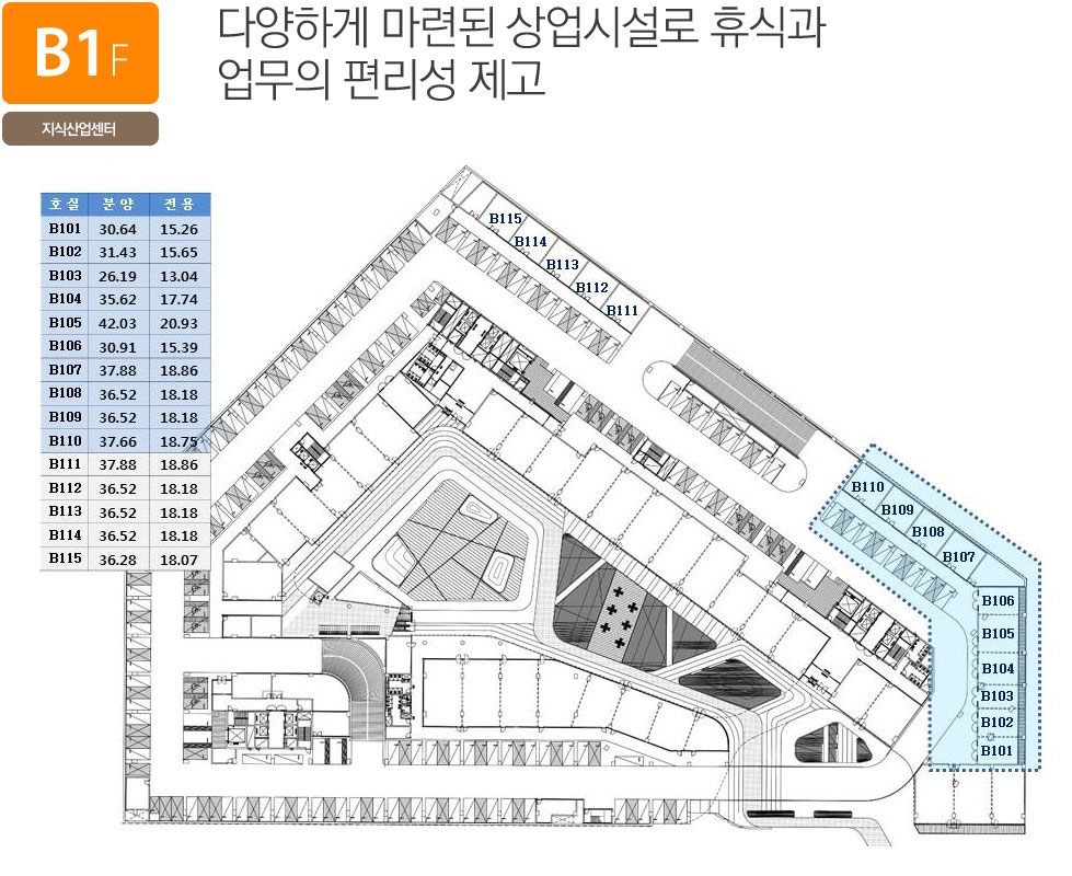 단지는 6,467.45평의 넓은 대지에 지하 3층~지상 10층, 연면적 31,183.03평 규모이며, 지하 1층부터 지상 2층까지는 지원시설(상가), 지상 2층부터 10층까지는 지식산업센터와 일부 업무시설로 구성되었습니다. 용도별로 지식산업센터 3개동(A동, B동, C동) 538실, 지원시설(업무) 39실, 지원시설(상가) 133실 등으로 각각 구성되었습니다.