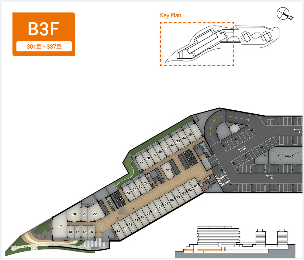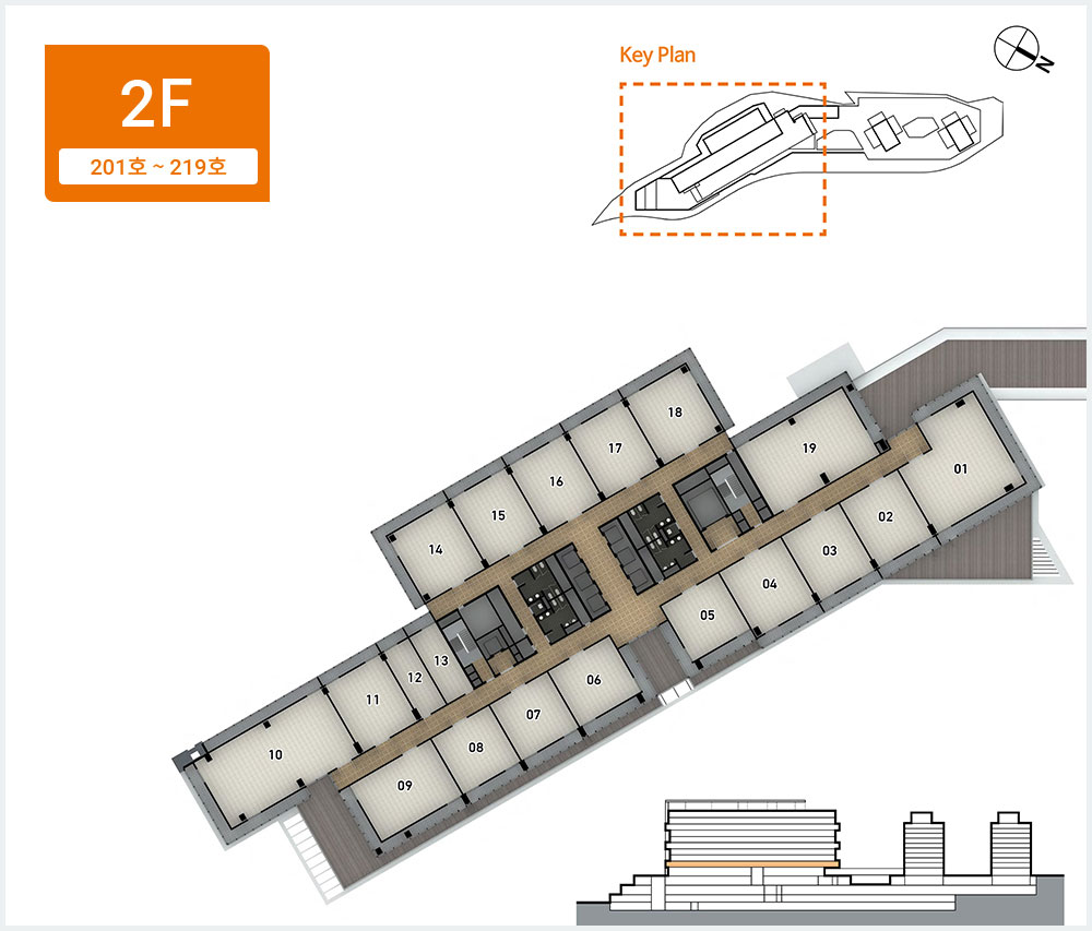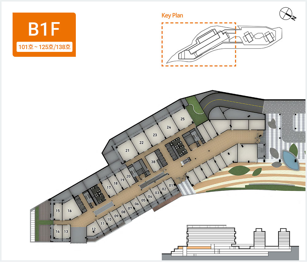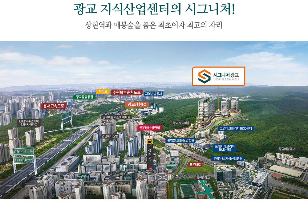 입지는 경기도 용인시 수지구 상현동 광교신도시 내에 위치해 있으며, 신분당선 상현역과 도보 10분 거리에 있습니다. 수원과 용인을 연결하는 포은대로에 접해 있어 단지 접근성이 매우 뛰어나며, 무엇보다 광교 신도시 내에 포함되어 기업하기 좋은 입지여건을 갖추고 있다는 평가를 받는 지식산업센터입니다.